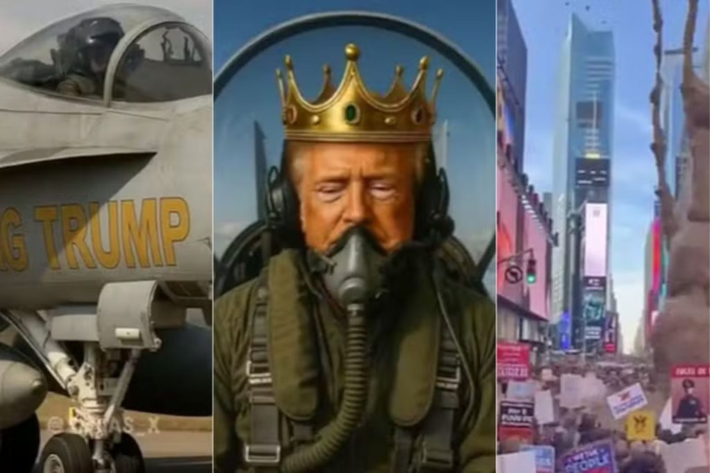 O presidente dos Estados Unidos, Donald Trump, publicou neste domingo 19 um vídeo gerado por inteligência artificial em que aparece pilotando um avião militar e lançando “bombas” que se assemelham a fezes sobre manifestantes dos protestos “No Kings” (“Sem Reis”). O vídeo foi divulgado na rede social Truth Social e mostra Trump usando uma coroa […]