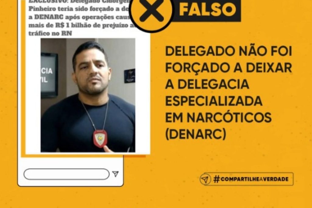 É falso que o delegado Cidorgeton Pinheiro foi forçado a deixar a Delegacia Especializada em Narcóticos (Denarc), que é veiculada à Divisão Especializada em Investigação e Combate ao Crime Organizado (Deicor). A notícia enganosa foi publicada na página de um perfil no Instagram, além de ser compartilhada em grupos de WhatsApp. A transferência, como já […]