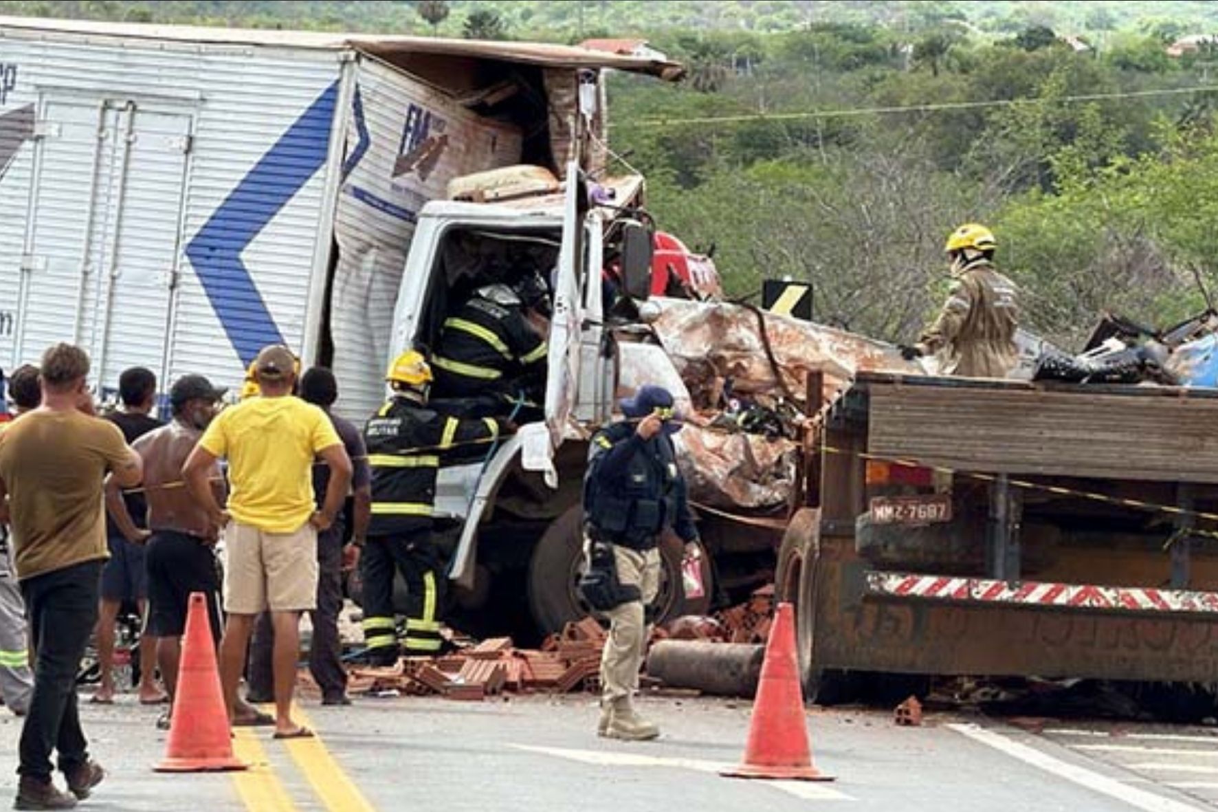 Após o impacto, o veículo que transportava tijolos tombou, espalhando parte de sua carga para fora da pista. O condutor do caminhão baú, um dos feridos, foi resgatado com vida pela equipe do Corpo de Bombeiros, após quase uma hora de intensos trabalhos no local.