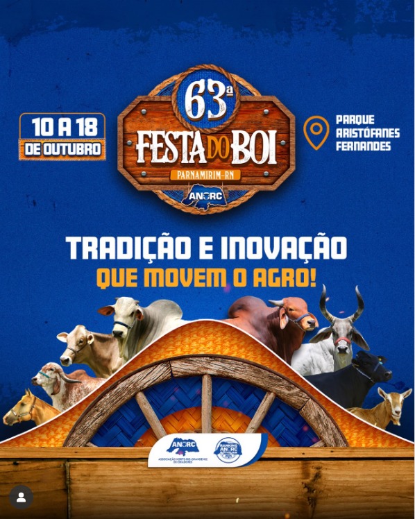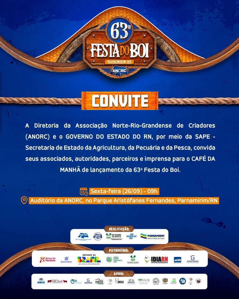 A Associação Norte-Rio-Grandense de Criadores (ANORC) promove, nesta sexta-feira (26), às 9h, o café da manhã de lançamento da 63ª Exposição de Animais e Máquinas Agrícolas – Festa do Boi 2025. O evento será realizado no auditório da Associação, localizado no Parque de Exposições Aristófanes Fernandes, em Parnamirim.