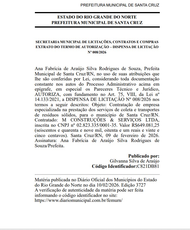 O Ministério Publico do Rio Grande do Norte quer entender a contratação realizada pela Prefeitura de Santa Cruz, na última segunda-feira (09), por meio de dispensa de licitação. Desta vez, com a empresa M Construções e Serviços LTDA (MB). No montante de R$ 649.081,25 (seiscentos e quarenta e nove mil, oitenta e um reais e vinte e cinco centavos). O Contrato é assinado pela Prefeita Ana de Cleide.